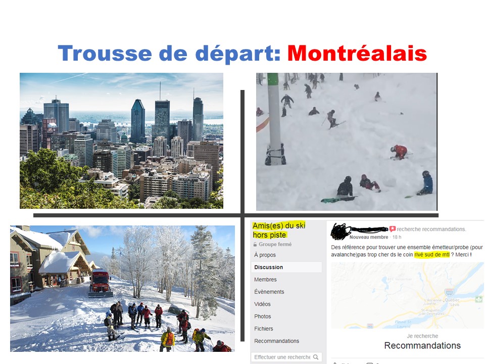 Le skieur montréalais représente une grande partie de la communauté du ski hors-piste. Il habite la région métropolitaine, et peut se retrouver à Saint-Jérôme, Longueuil, Laval, la région autonome du Plateau ou Hochelaga. Deux points les unissent : un désir de se faire considérer comme des skieurs hors-piste, et un manque de connaissance et d’expérience flagrant.