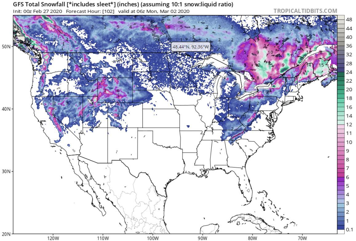 Malheureusement pour vous, ces deux régions tomberont directement dans le même point sec que les Greens. Mis à part du vent, il n’y aura pas grand-chose de spécial aujourd’hui sur ces secteurs. Pour l’Estrie, la pluie fera place à une faible neige en avant-midi. Les accumulations seront concentrées en montagne puisque la neige sera fondante à basse altitude. Il pourrait même pleuvoir toute la journée sur les champs de la Montérégie. Les montagnes frontalières pourraient mieux s’en sortir et accumuler un joli total aujourd’hui, mais un déplacement de la trajectoire de la dépression de 50 km vers l’est ferait buster cette prévision. Les secteurs de Sutton et Orford pourraient ensuite profiter de l’évènement de soulèvement orographique vendredi pour sauver la donne. Cela reste incertain par contre. Total de la tempête samedi matin : 5-20 cm