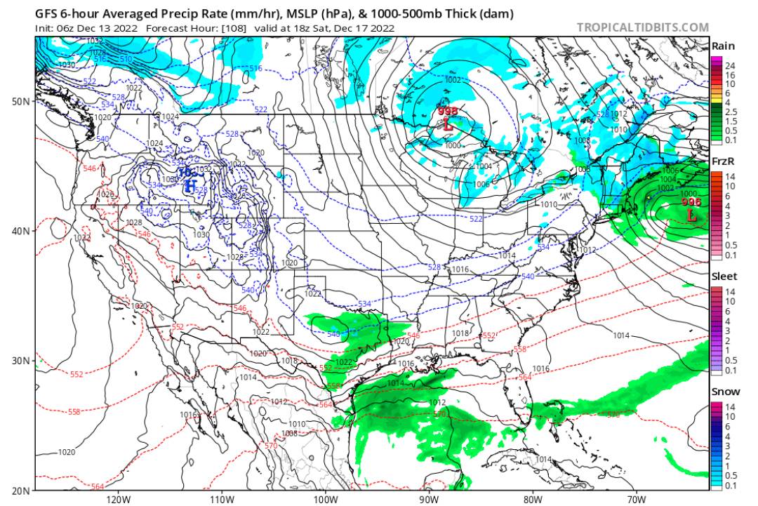 Le changement du patron météo vers quelque chose de plus neigeux semble se confirmer. Un autre système plutôt complexe encore une fois devrait nous affecter vers la fin de la semaine prochaine. En premier lieu, un système sur le continent causera apparemment en milieu de semaine une interaction avec entre les courants-jets polaires et tropicaux. Cela devrait générer une forte zone d’instabilité qui pourrait faire son chemin jusque sur la côte est du continent. Une dépression devrait alors se former sur les secteurs de la Nouvelle-Angleterre avant de progresser très lentement au large des côtes au cours de la fin de la semaine avant de venir mourir en Gaspésie, n’ayant aucune issue due à un blocage dans l’atlantique nord. Cela pourrait donc nous générer des bandes de précipitations potables comme des averses au cours de toute la fin de semaine sur tous les secteurs montagneux du Québec. Les modèles divergent toutefois encore quant à l’intensité du blocage. Si celui-ci laisse juste assez de place au système pour qu’il s’organise, on pourrait avoir un joli cadeau juste avant le début des vacances. Les prévisions devraient s’éclaircir au cours des prochains jours.