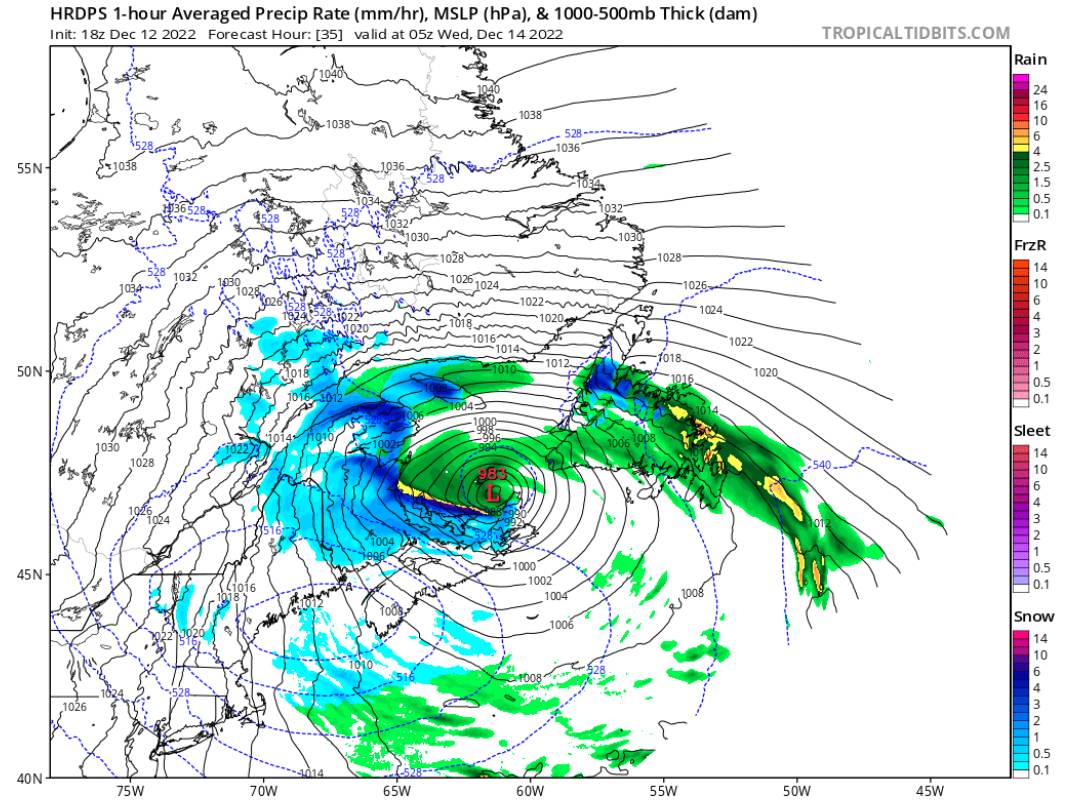 Le système devrait passer assez rapidement alors qu’il se dirigera plein sud vers la Nouvelle-Écosse au cours de la nuit. Toutefois, le courant-jet en basse altitude généré par le système persistera apparemment. Cela devrait encore une fois concentrer les précipitations sur les contreforts de la Haute-Gaspésie et la pointe où l’on pourrait accumuler jusqu’à jeudi matin. Les totaux pourraient être impressionnants et dépasser les 60 cm sur les secteurs de Gaspé, Murdochville et sur les contreforts de la Haute-Gaspésie. Les secteurs pourraient également accumuler de 20 à 40 cm tandis que les secteurs de la Baie-des-Chaleurs et de la vallée de la Matapédia ne verront que quelques centimètres. Il faudra être au bon endroit au bon moment toutefois pour profiter de bonnes conditions sur les endroits à basse altitude puisque l’on flirtera avec le point de congélation mercredi. Il est même possible que les plus grosses accumulations chauffent mercredi avant même que cela ait fini de tomber. La neige de tempête devrait être particulièrement dense plus près des côtes et sur la pointe et devrait être moins cohésive au fur et à mesure où vous vous éloignez du fleuve.