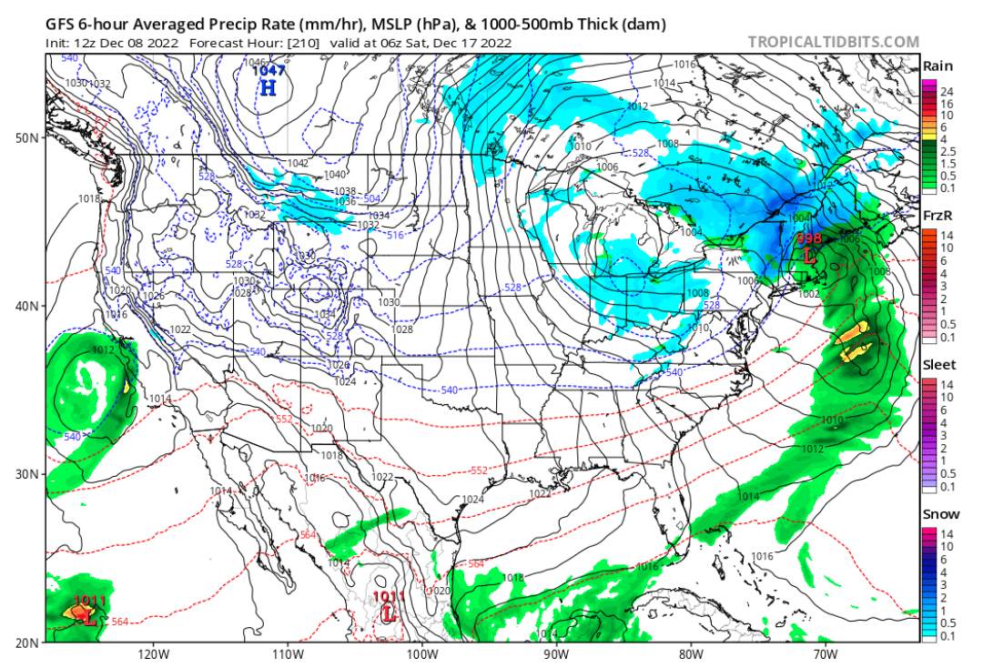 Notre prochain système plus généralisé devrait nous atteindre vers la fin de la semaine prochaine. Encore une fois l’incertitude plane alors que les modèles passent de scénarios allant de la douche pour tous à une bonne chute de neige jusque dans le sud. Les dates du 14 au 16 décembre sont à surveiller. Malgré tout, il y a un peu d’espoir à la veille du début des vacances. Les ensembles de modèles semblent vouloir de plus en plus privilégier une circulation favorable à l’air froid dans l’Est. Il semble donc y avoir de l’espoir de revoir les systèmes commencer à adopter des trajectoires plus à l’Est au cours des prochaines semaines. Avec un certain blocage qui semble vouloir rester présent dans l’Atlantique-Nord, j’ai l’impression que la situation pourrait commencer à s’améliorer sur l’ensemble des secteurs après la mi-décembre. Tout ne semble pas perdu pour ceux qui veulent chausser les skis hors des surfaces travaillées mécaniquement dans les dernières semaines de 2022. Reste à voir si le tout se mettra réellement en place. À suivre.