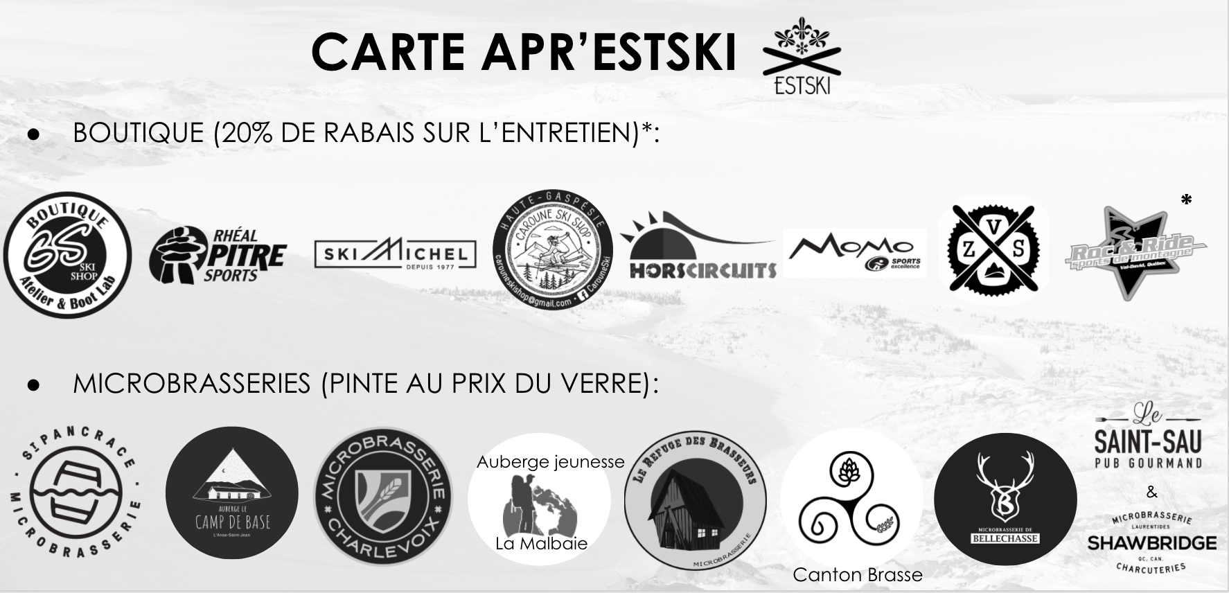 Profiter davantage chez nos partenaires avec la carte Apr’Estski. Le but est de développer un réseau officiel de commerces indépendants dans chaque région du Québec. Les ateliers ci-dessous ont gracieusement accepté d’offrir aux membres d’Estski 20 % de rabais sur l’entretien de leur équipement :
