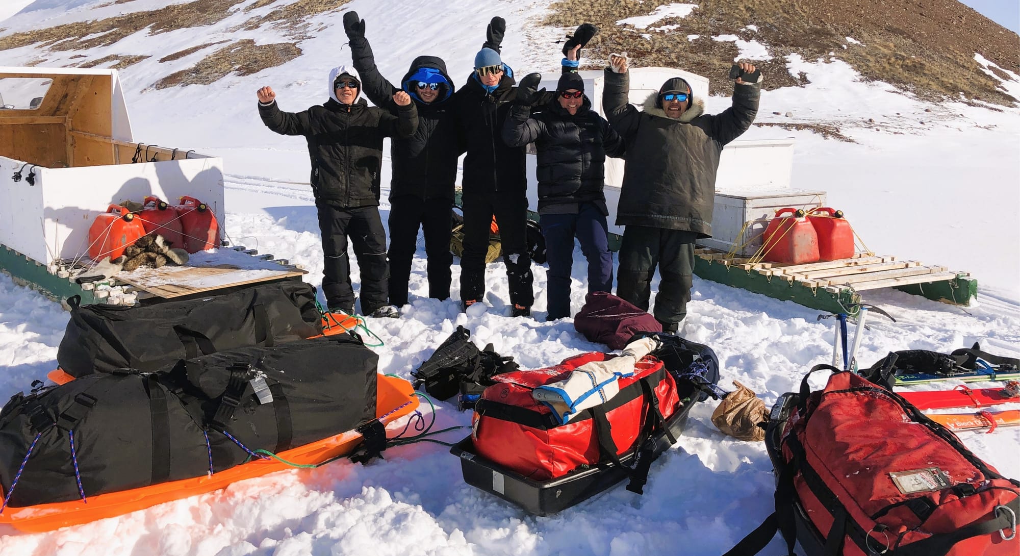 Le départ se fait donc le 3 mai à Arctic Bay, un petit village inuit de quelque 800 personnes situé à 73 degrés nord de latitude. Après un court trajet en motoneige (25 km) pour traverser l’un des nombreux fjords entourant le village, nos amis Inuits nous déposent à l’embouchure du delta de la rivière Strathcona. Nous sommes maintenant sur la péninsule de Borden, au km « 0 » de notre traversée. Il fait beau, la température avoisine les -5°C et nous voyons une grande étendue de neige vierge qui nous sépare des montagnes au loin.