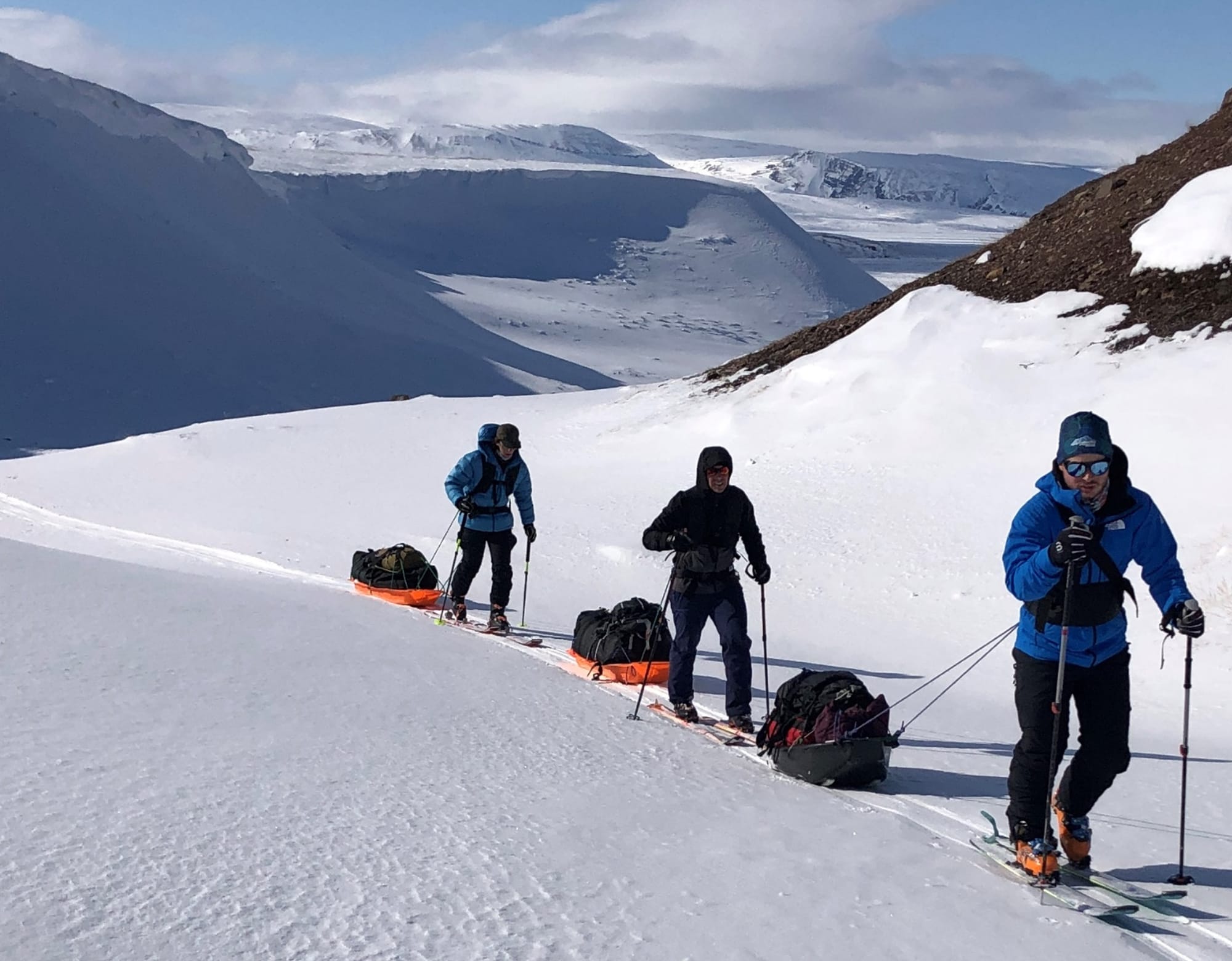 Les premiers jours sont variés avec plusieurs montées et descentes. Nous devons traverser quelques canyons et ravins qui demandent beaucoup d’efforts, mais en général, nous prenons de l’altitude graduellement pour atteindre les 700 m. Rapidement, sous l’effort que nous devons déployer pour avancer avec nos traîneaux chargés de 25 jours de nourriture, de carburant et d’équipement - tout pour assurer notre périple en pleine autonomie - nous saisissons l’isolement et l’étendue du travail qui nous attend.