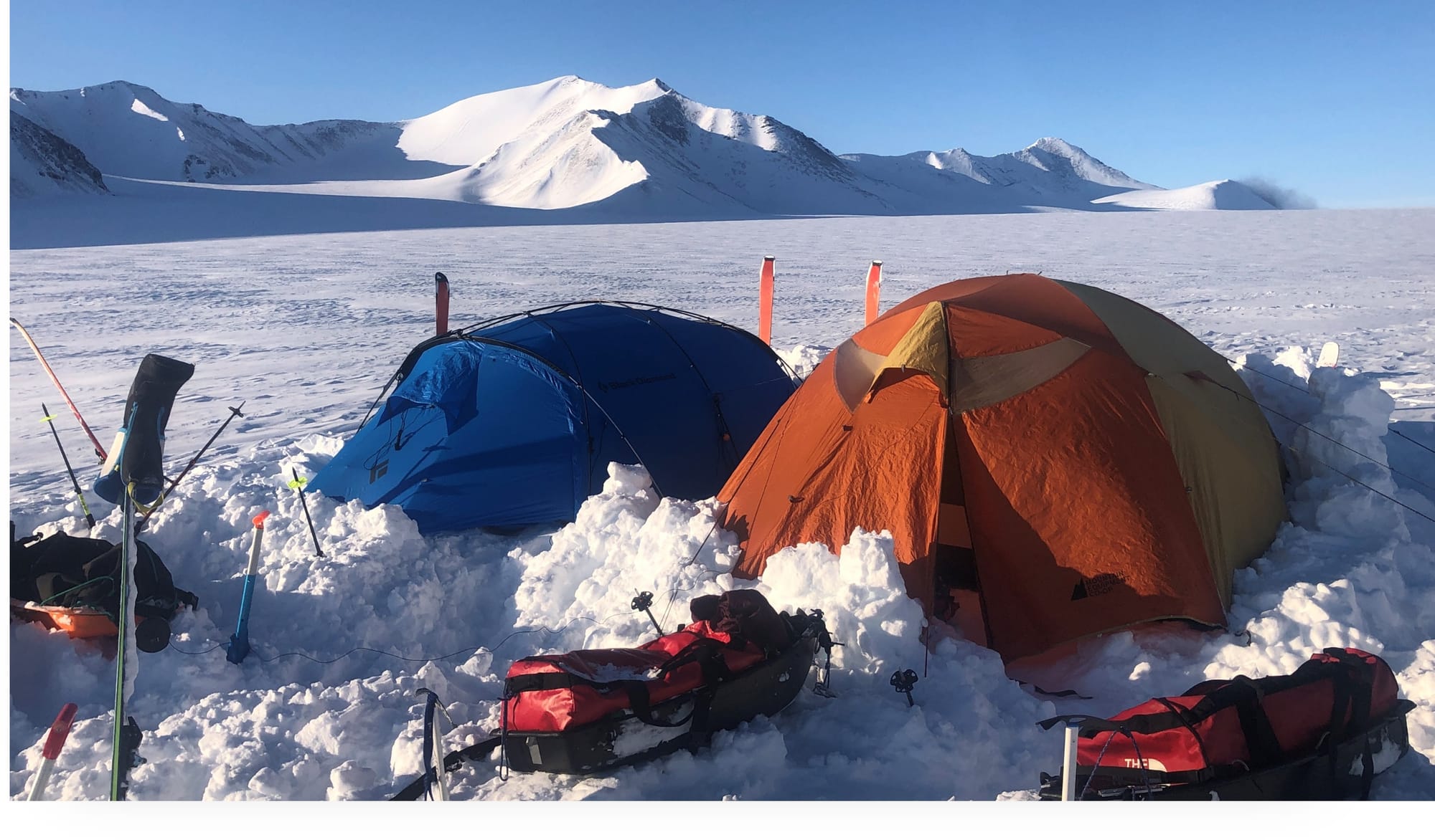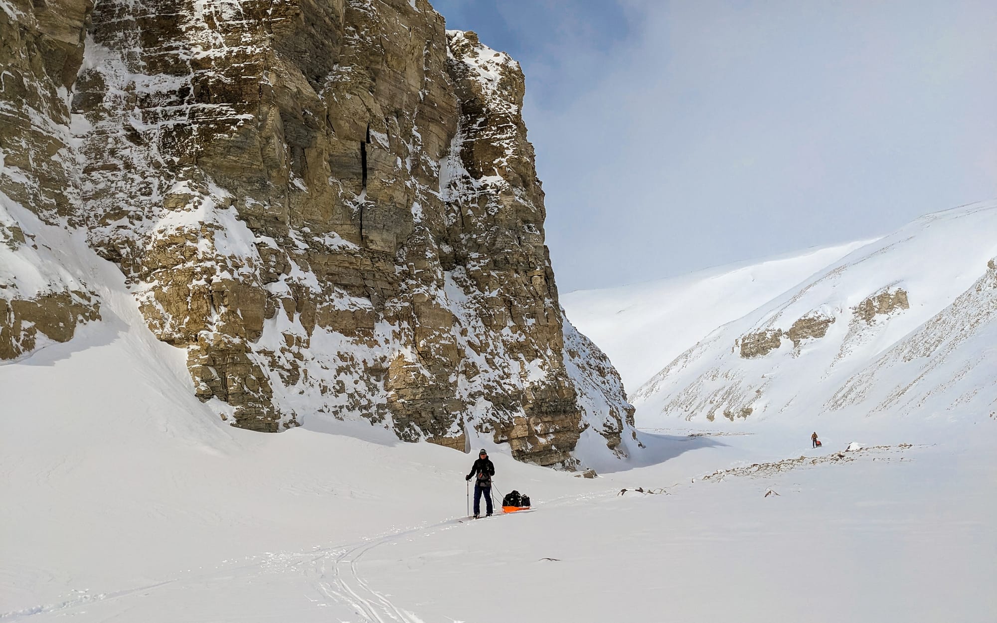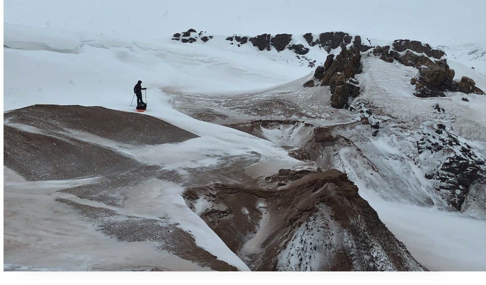 Après quelques faux espoirs où nous nous retrouvons bloqués par une topographie complexe et abrupte de falaises impraticables avec nos traîneaux, nous trouvons une voie de passage entre glaciers qui nous permet de quitter les hauts plateaux et commencer notre descente dans la Kilutea. Nous perdons rapidement plusieurs centaines de mètres d’élévation et nous nous retrouvons bien encaissés dans les hauteurs du canyon. À partir de ce moment, nous savions qu’il nous serait difficile – voire impossible – d’opérer un demi-tour et de remonter sur les plateaux. En conséquence, le jeu est simple : nous devrons trouver une sortie en suivant le canyon.