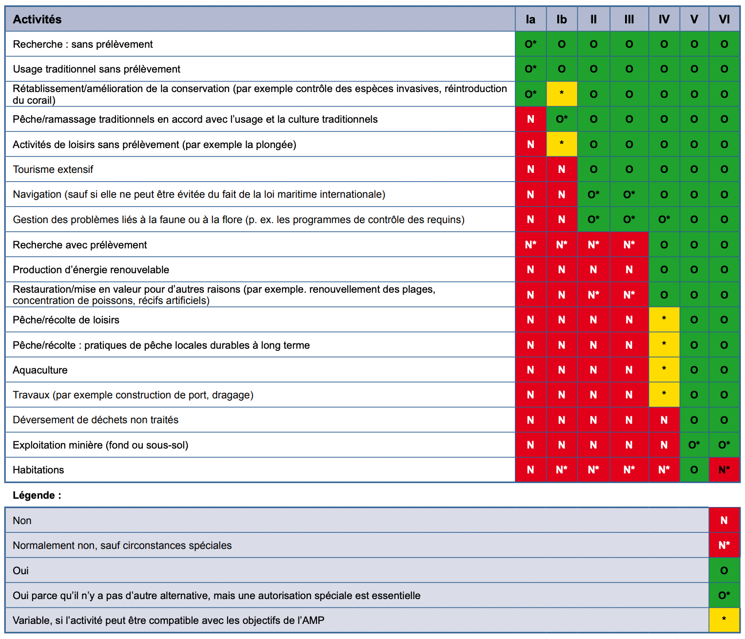 Après s'être situé dans la catégorie de conservation du tableau 1, on peut se rapporter au tableau deux pour voir les activités qui peuvent être appropriées selon l'IUCN. Le ski hors-piste pourrait se classer comme une activité de loisir sans prélèvement ou le tourisme intensif selon l'interprétation. Bref, le ski hors-piste n'est pas dans l'esprit de la conservation pour la catégorie 1a et 1b. À noter que ce n'est pas parce que c'est vert dans le tableau ci-dessous qu'on a l'doua.